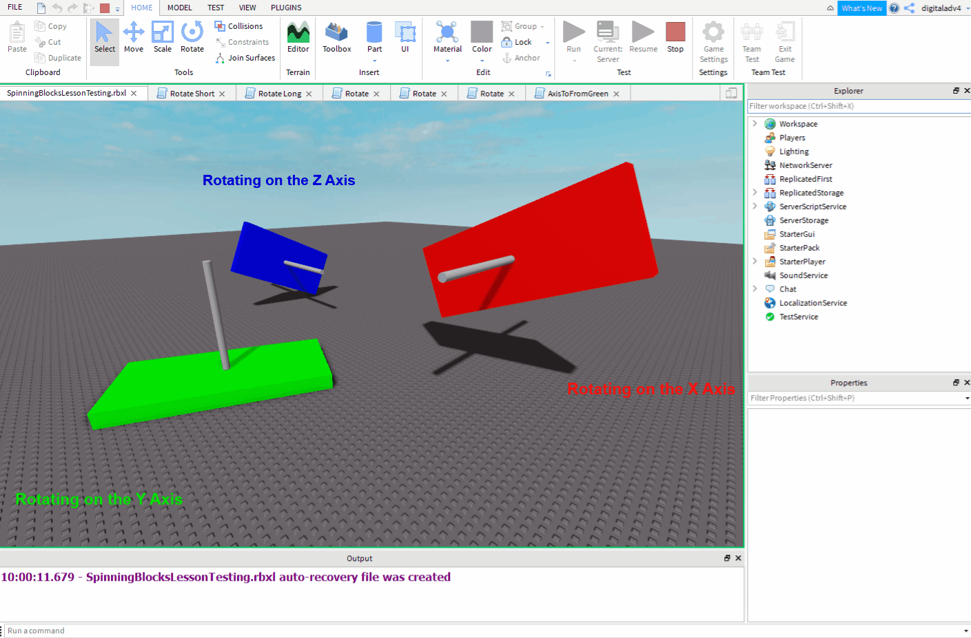 In a new block, change the code so that the block rotates in a different direction from your original, which rotates on the Y axis.