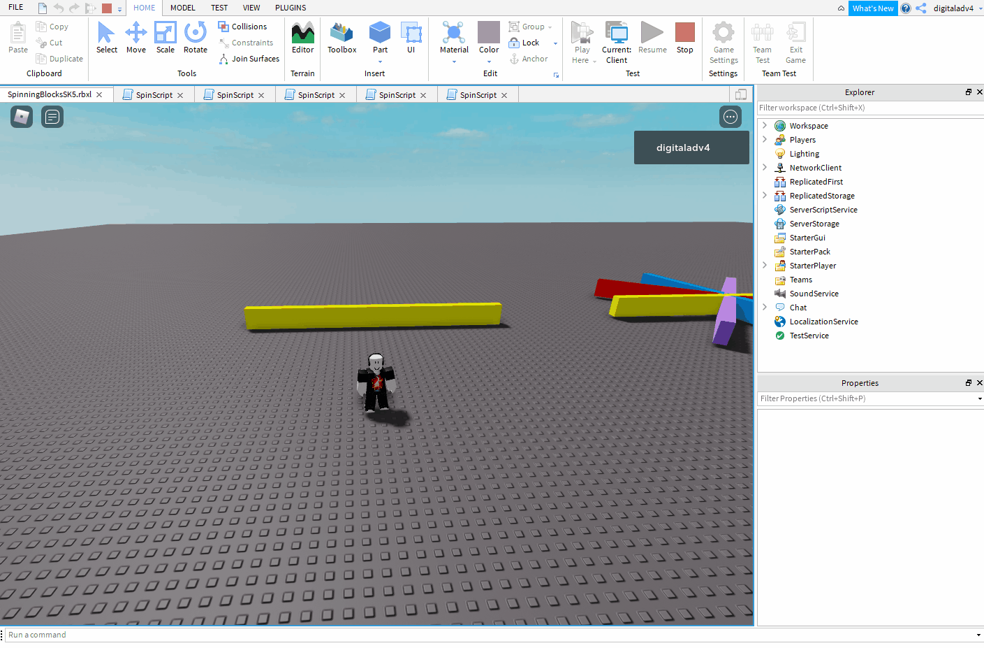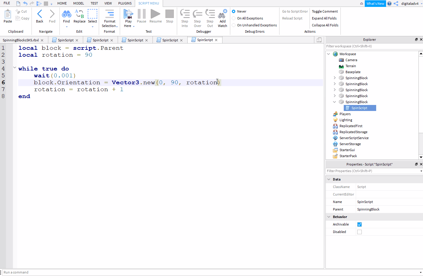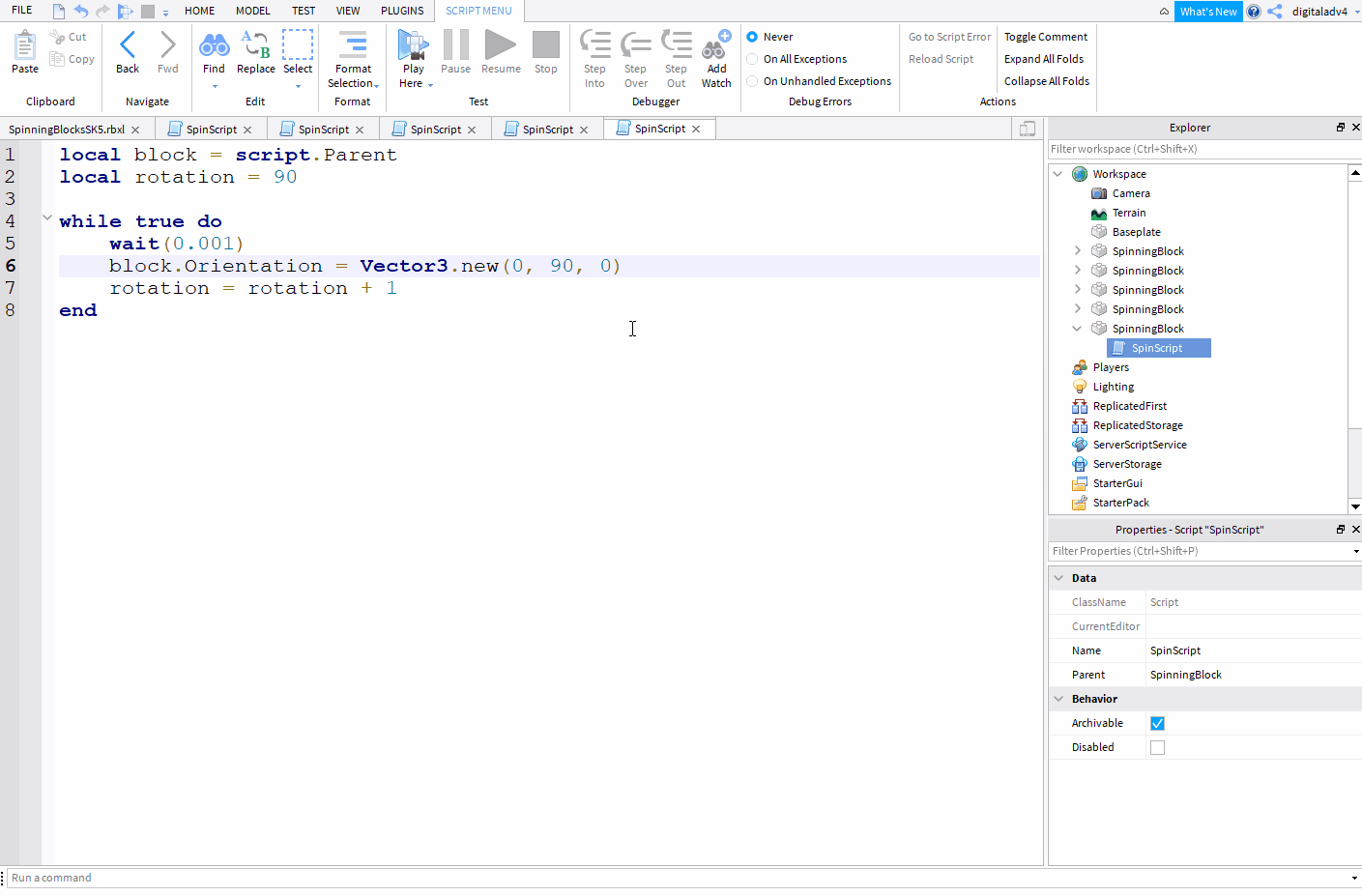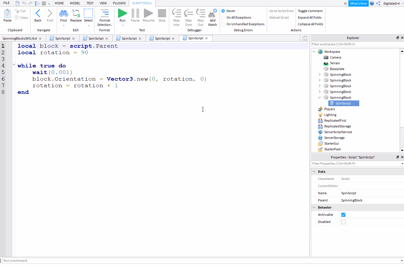 Find your new SpinningBlock in the Explorer, then click the arrow next to it to show the files inside. Double click on 'SpinScript' to open it.