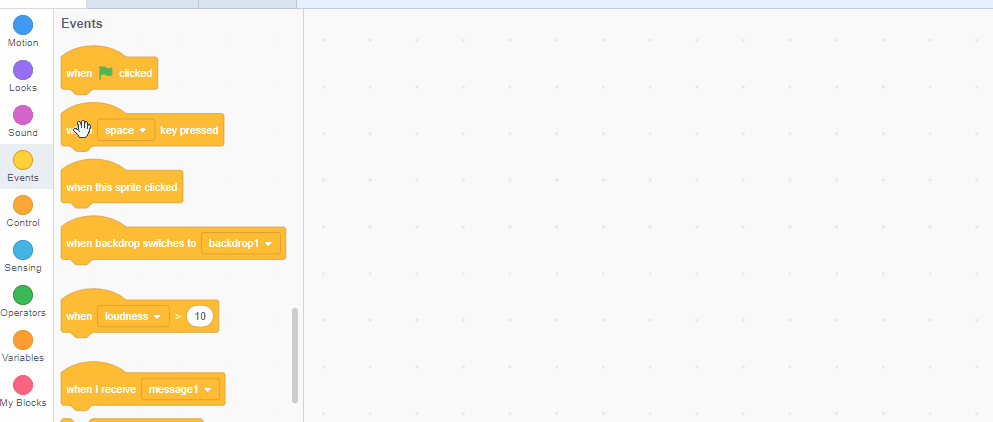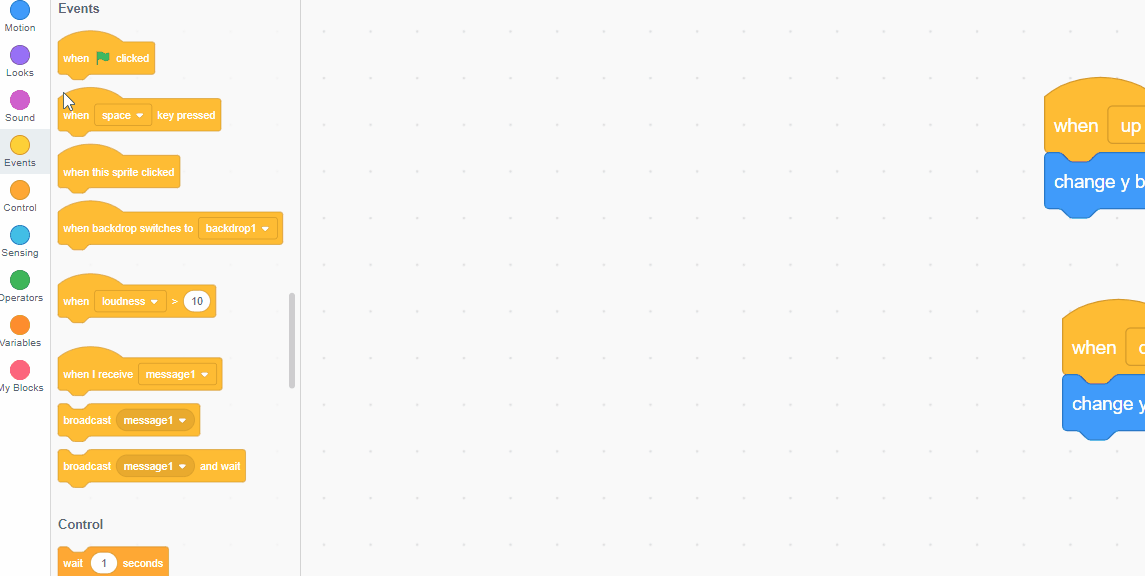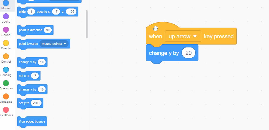Select a "when up arrow key" clicked block and add a "change Y by 10" block from the motion tab.