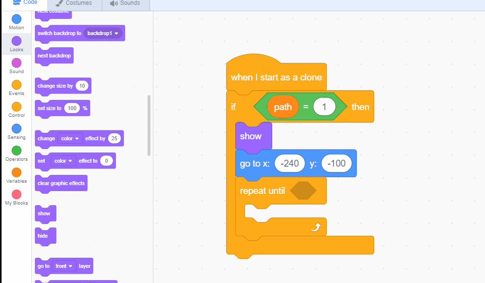 Think quickly about what loop would be best to move our clone. We can choose from: "Repeat __", "Forever" and "Repeat until ___". It might help to think about our movement as going until we hit the right side of the screen.