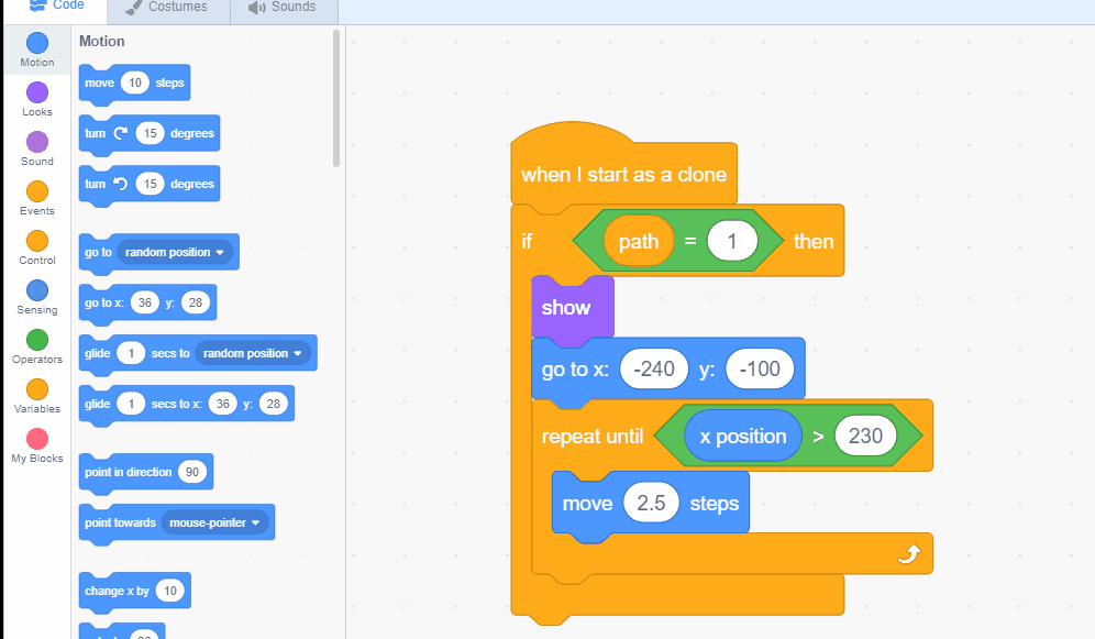 Grab a "blank > 50" block from Operators and add it to our if statement. Then we change 50 to 230 and add the "x position" variable from the bottom of motion. Then add "move 2.5 steps" to the loop.