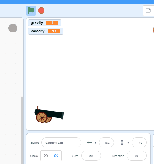 Similar to aiming the Cannon, we will use the mouse pointer to point the Cannon Ball in the direction we would like to launch. Let's also setup initial Gravity and Speed when the Cannon Ball is in the Cannon to be 1 and 13 respectively.