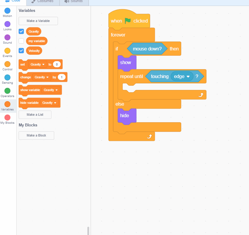 Put "set variable to 0" inside of the inside of the else side of the "if ___ then _______ else _______" statement twice. Then change it so one says "Gravity" and the other "Velocity". Finally set gravity to 1 and Speed to 13.