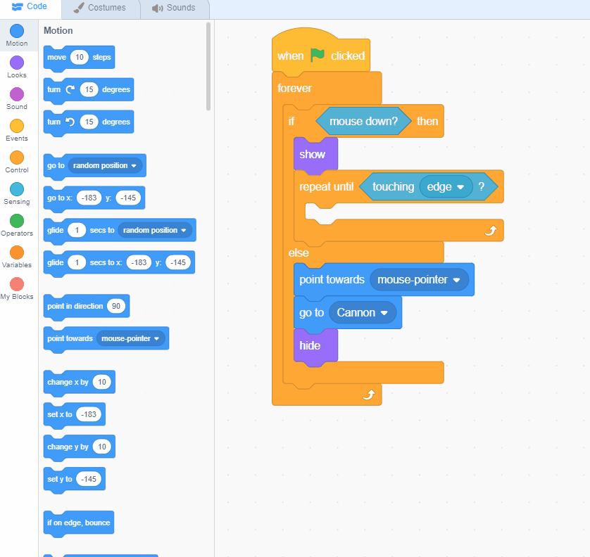 Use the "point towards mouse-pointer" and "go to _____" block inside of the else side of the "if ___ then _______ else _______" statement to put the ball inside the cannon and pointed to the Mouse Cursor before it launches.
