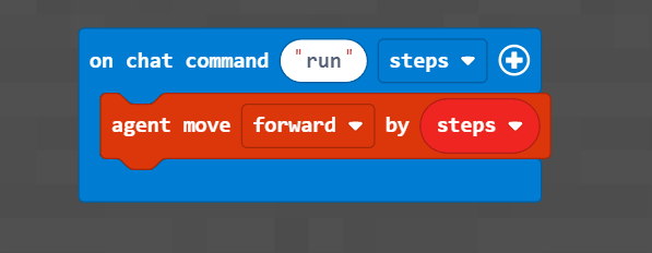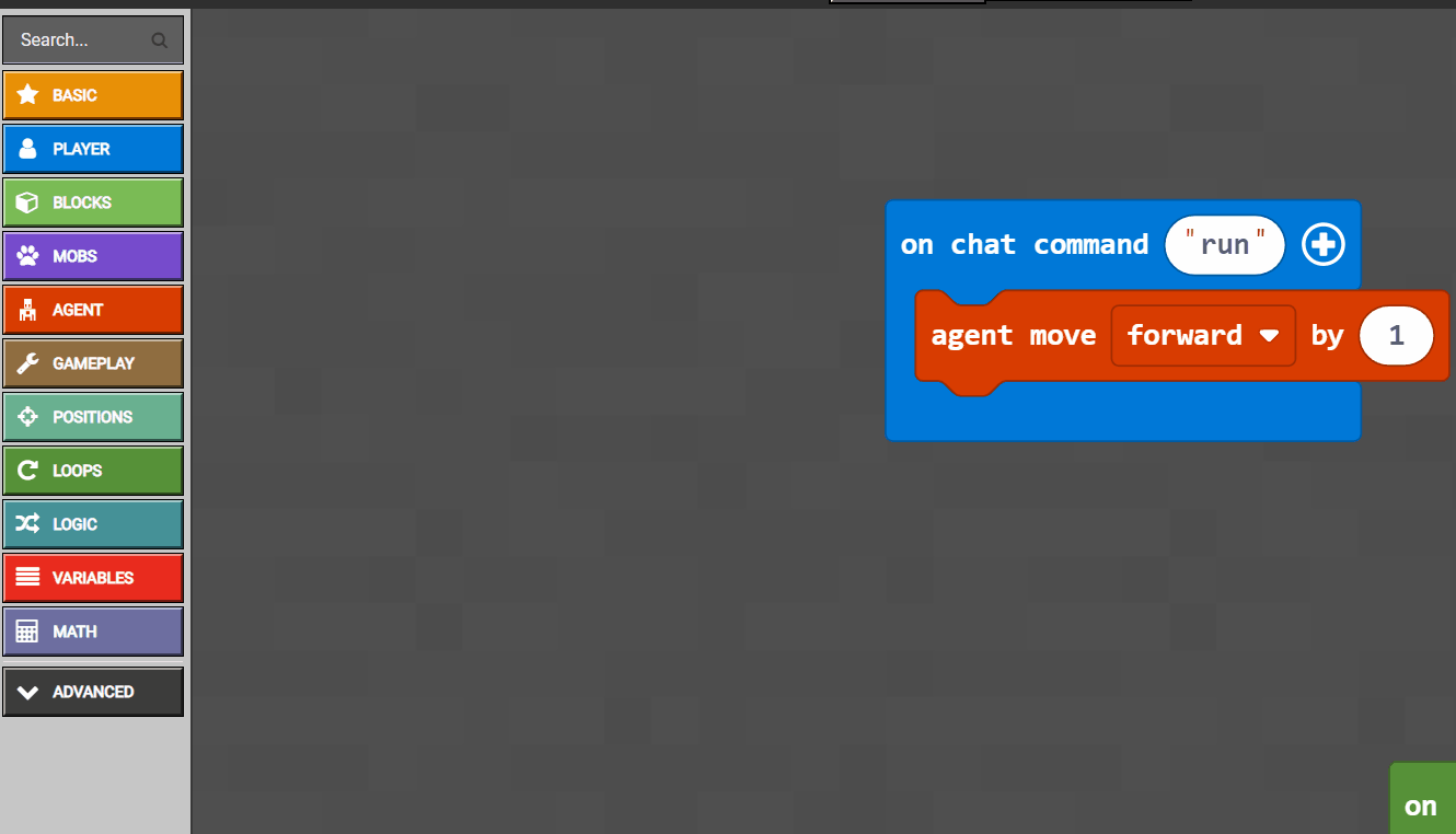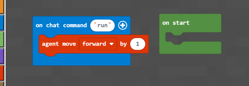 Head to the Orange Tab called Agent to find some of the first code we'll be adding to the game. If you notice in your screen we have a block called "on start" and one called "on chat command "run" ". We'll be focusing on the chat command today.