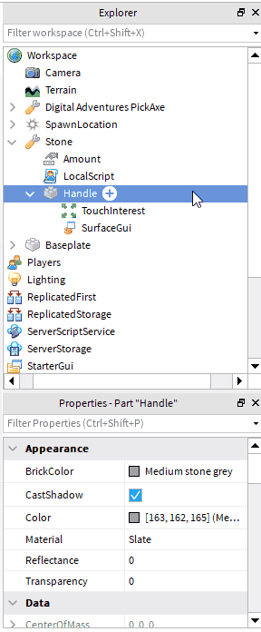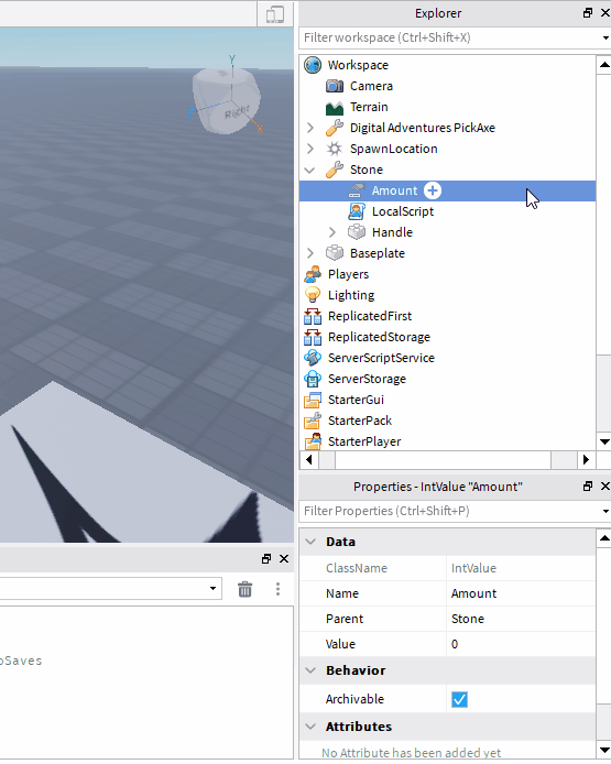 In the Explorer window, click on the plus sign next to your block tool and select 'IntValue'. You will use this to keep track of the number of blocks, of this material, that the player has.