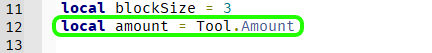 At the beginning of your code, create a new local variable called 'amount' and set it equal to Tool.Amount.