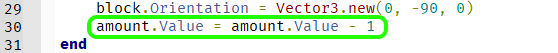 At the end of you 'makeBlock' function, make a new line the sets 'amount.Value' equal to 'amount.Value - 1'.