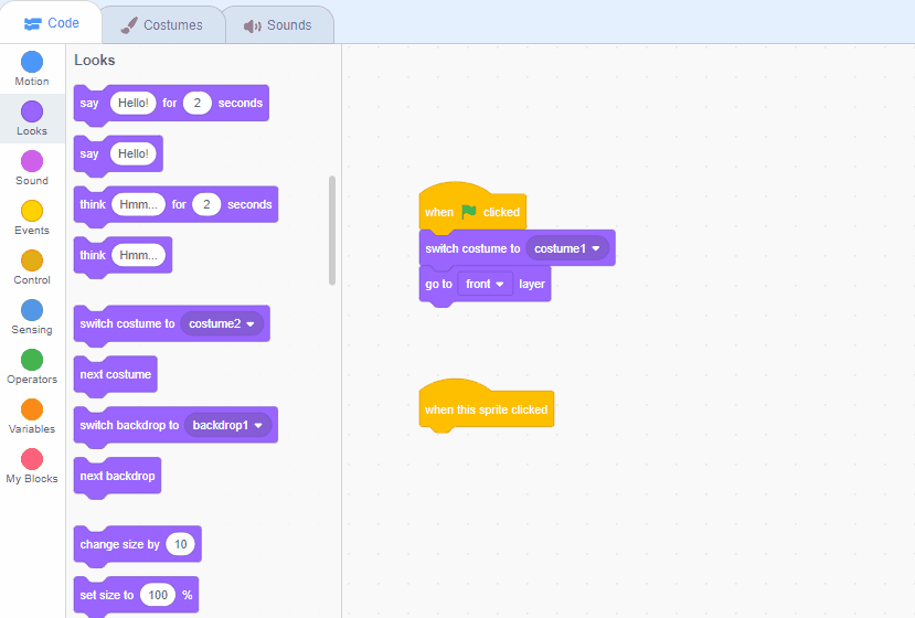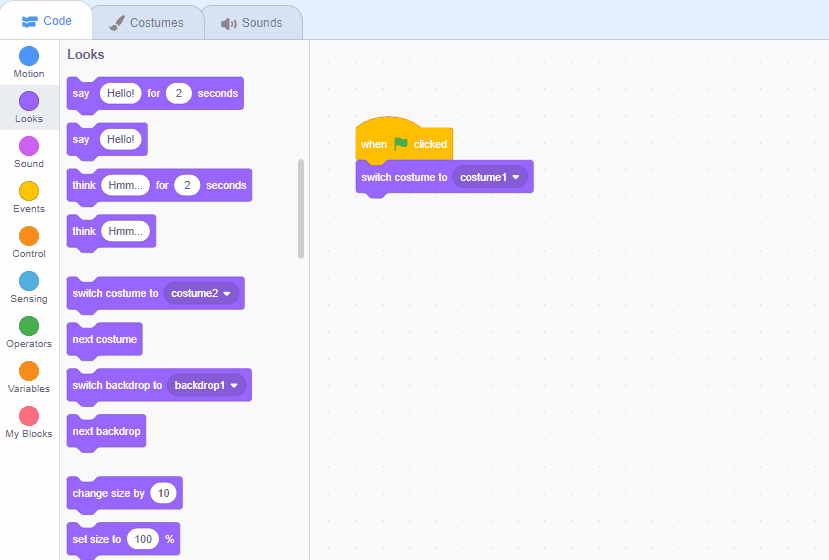 This is a purple looks block! It's the 5th block. Can you make sure the block switches to your first costume? This is the picture where the cup is lowered.