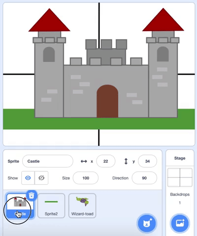 Change the size of your enemy sprite so that it is at least smaller than your castle. You do not need to position the enemy sprite, because we will do that with our code.
