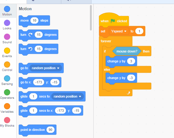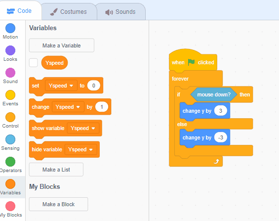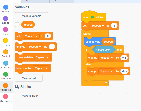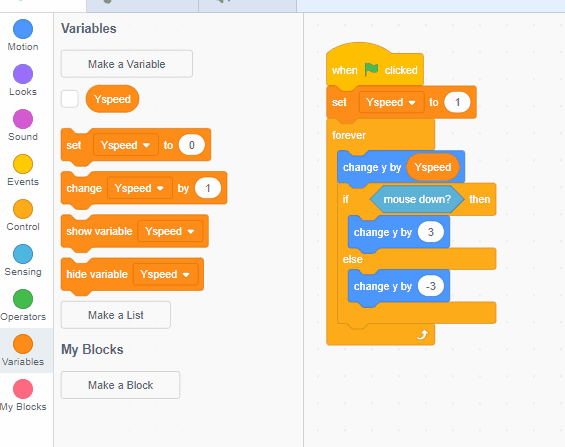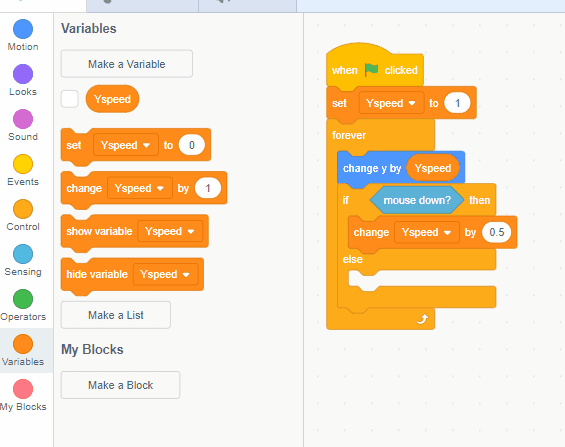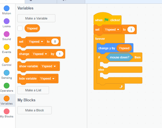 Inside the "then" part of this statement, grab an orange "variables" block called "change ___ by ___." Set it to your Y Speed variable, and then change it by a positive number.