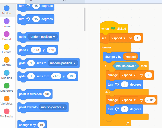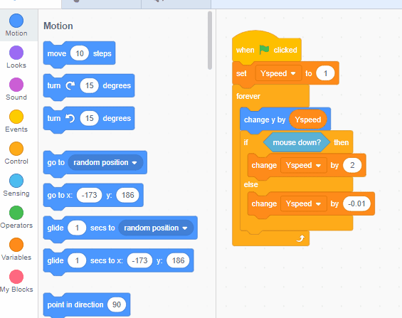 Inside the "else" part of this statement, grab an orange "variables" block called "change ___ by ___." Set it to your Y Speed variable, and then change it by a negative number.