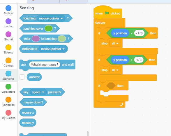 You can either add this in with the other if-statement blocks, or start a new piece of code. In the example, it's going along with the other if-statement blocks that end the game.