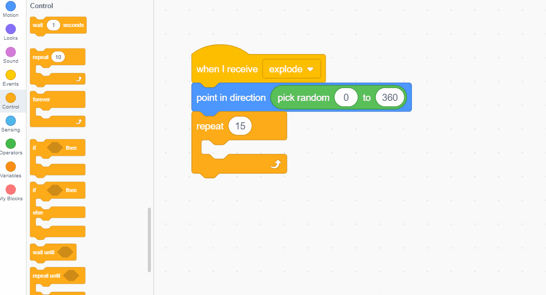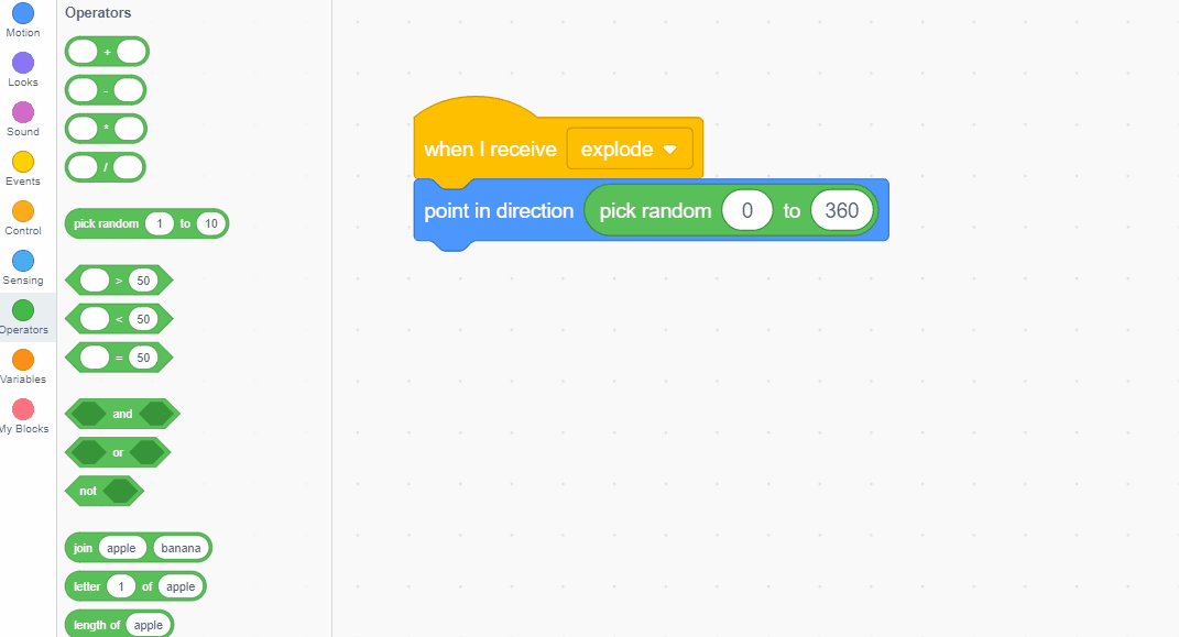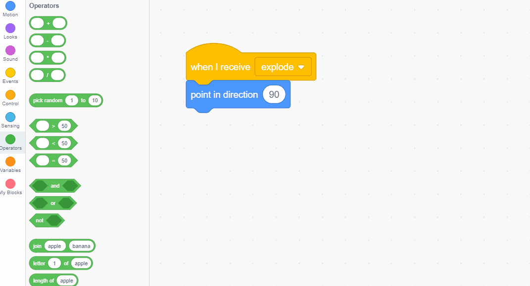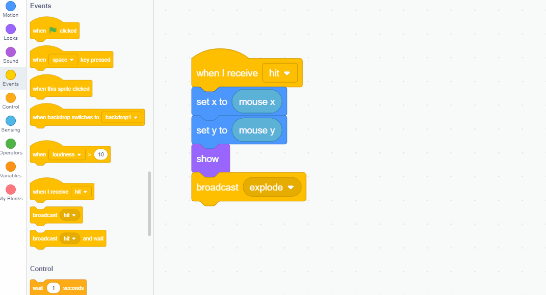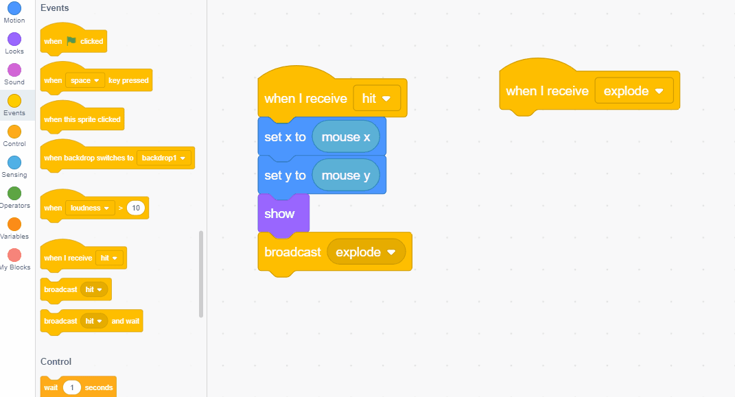 Look for the “when I receive ____” block in the Yellow Events Tab. Make sure to switch it to the "explode" event we created last challenge.