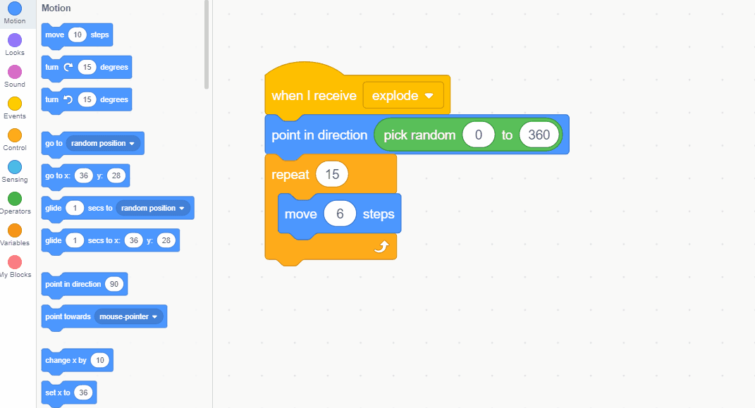 When a particle receives the explosion event it should point in a random direction and move several steps in that direction. Use random numbers and a repeat loop to accomplish your goal.