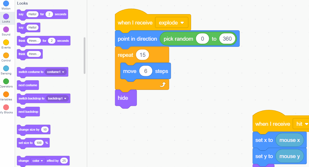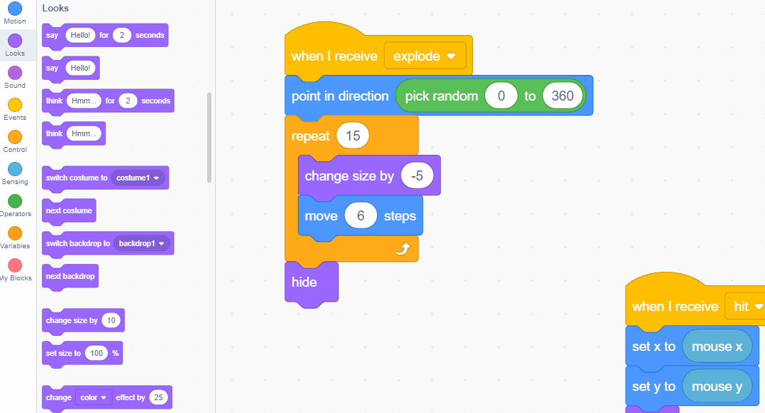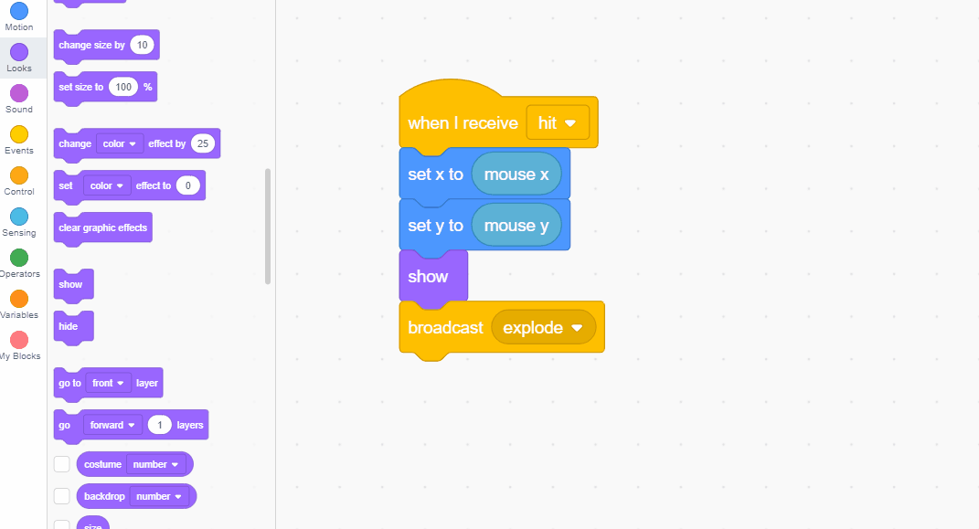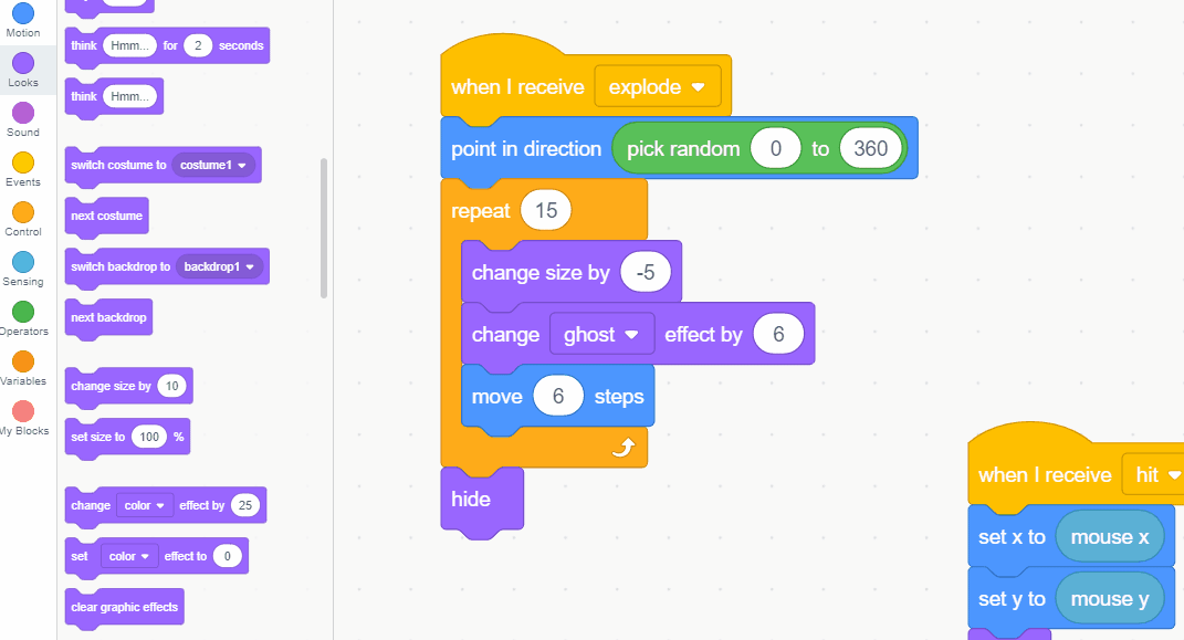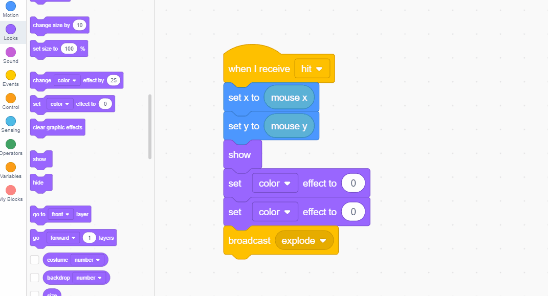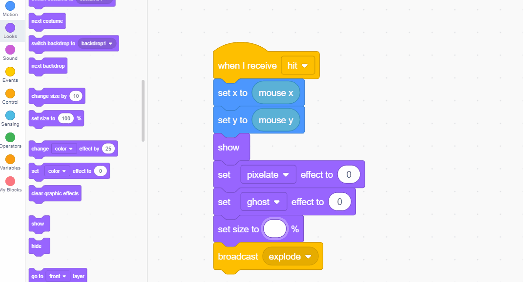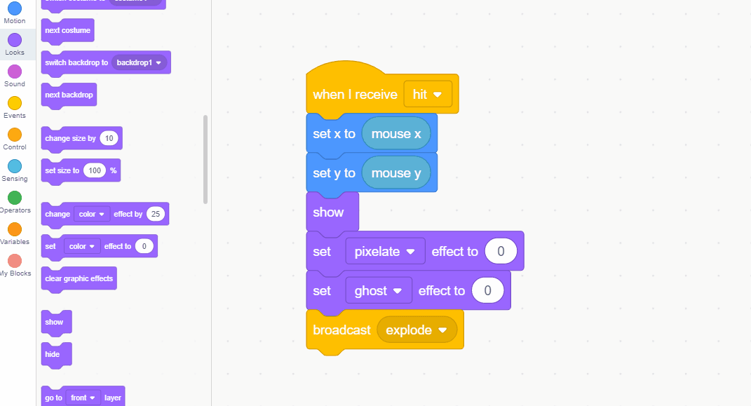 Head to the “when I receive hit” block and the Purple Looks tab. Grab a "set ___ effect to __" block and put one below the "show" block. Then add a second.