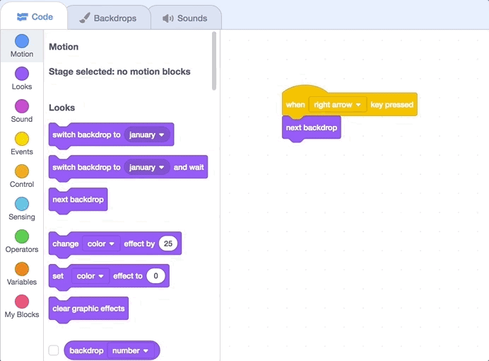 Now, let's write some code to show all your pages in a row! When you hit the "space" key, you should be able to see all the backdrops you made. What code blocks do you think will be important here?
