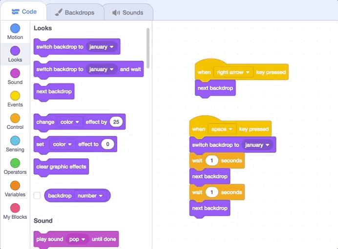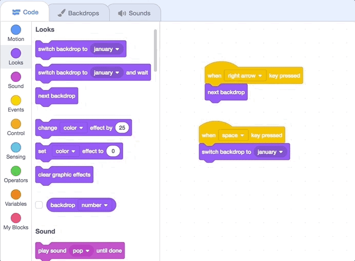 First, we'll need to add an event that checks if the space key is pressed and sets the background to January. Drag in a "when ____ key pressed" block from the yellow Events section. Then drag in a "switch backdrop to _____" block from the dark purple Looks section and make sure it's set to January.
