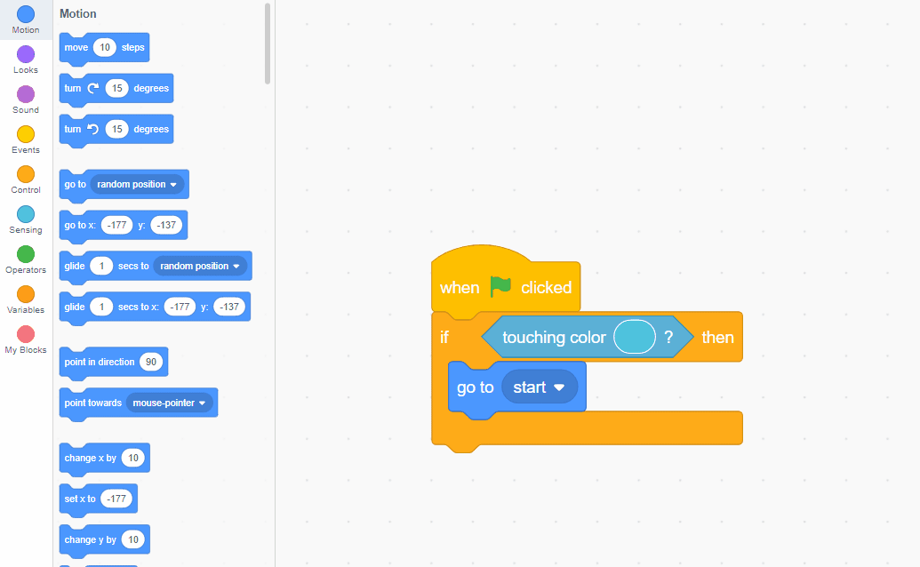 In English, we'd say a sentence like, "If the main character touches the wall, then they'll go back to the start." The if-statement block will help us write that in Scratch language.