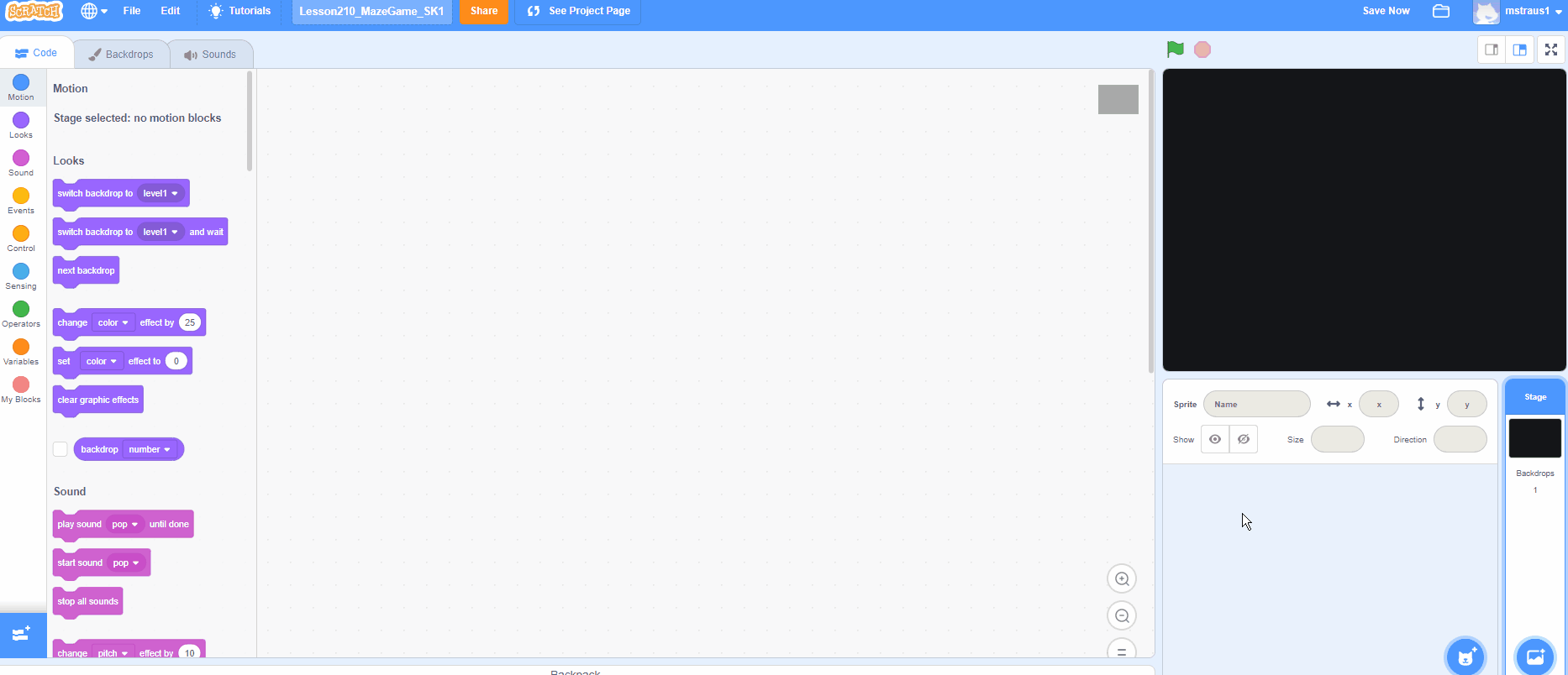 Using the backdrop editor, design another maze to become your level 2. Make sure the starting point is the same as level 1, but the end goal can be drawn somewhere else.