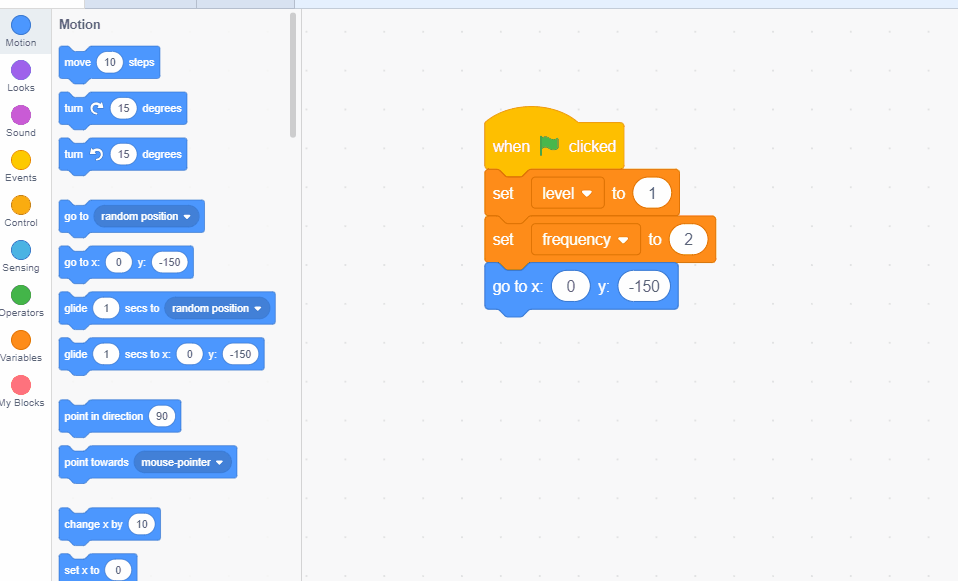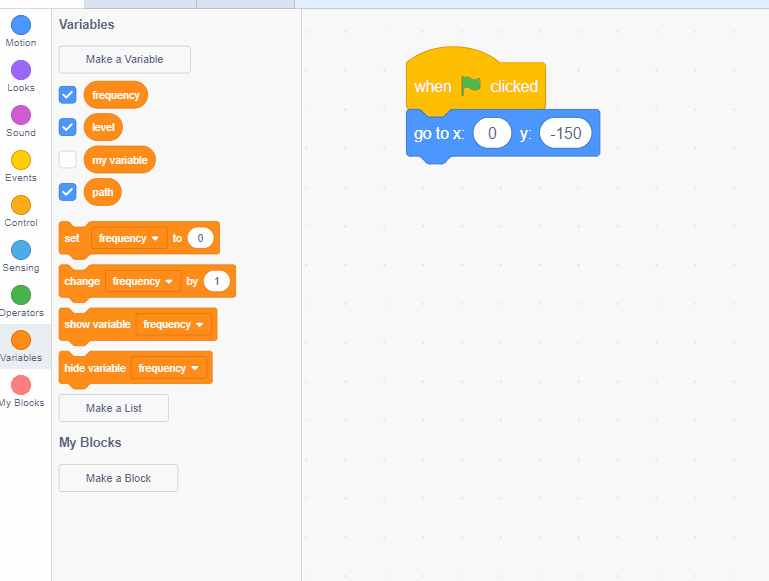 We need variables to keep track of the level, how often enemies appear, and which path enemies take. Before we worry about using them we have to make them in the "Variables" tab on Scratch. Our three variables will be named: Level, Path, and Frequency