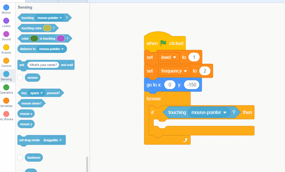 Let's adjust our condition to select the enemy! Switch the "touching mouse pointer" to "touching Enemy". Finally add the correct motion code to send our character back to the beginning. We want to be careful to use the same "go to x: 0 y:-150" block from earlier.