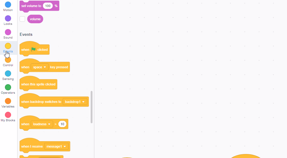 Add a "forever loop" from Control to run the first collision detection. The place an "if then" block inside and use the "touching mouse pointer" block as the condition.