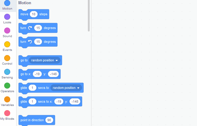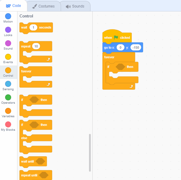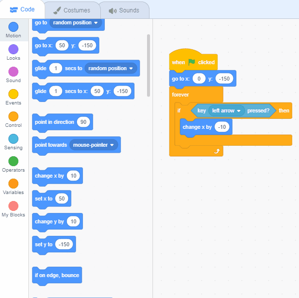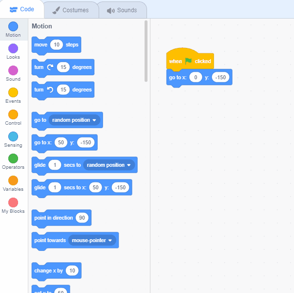 Head back to the "hero" sprites, let's use a "when green flag clicked" block. Using code from the motion tab, position your hero that it always starts at the bottom middle of the screen. The coordinates for that would be: (0 , -150).