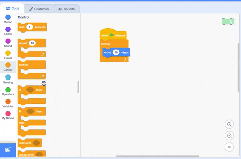 We don't want the motion to just happen once – we want it to repeat. To repeat code, we need to add a loop. Add a forever loop to keep your racer moving. Don't worry, we'll control the turn in the next step. You can find the forever loop in the orange "control" section.