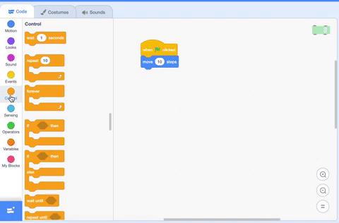 This block is a bit different than what we used on other challenges. It moves the sprite 10 steps in the direction that the sprite is facing. This is why it's important that your sprite faces right, otherwise the movement will look weird. You can find the "move 10 steps" block in the dark blue "motion" section.