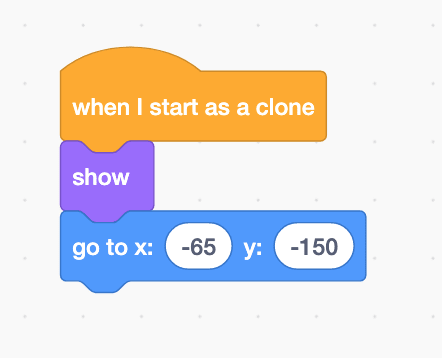 You want the clone to start at the bottom of the screen, lined up with the corresponding arrow at the top of the screen. The starting Y position will be at the bottom of the screen, which is around -150. The starting X position will be the same as the corresponding arrow sprite at the top of the screen. (For example, the Left Arrow should start at X: -185, Y: -150)