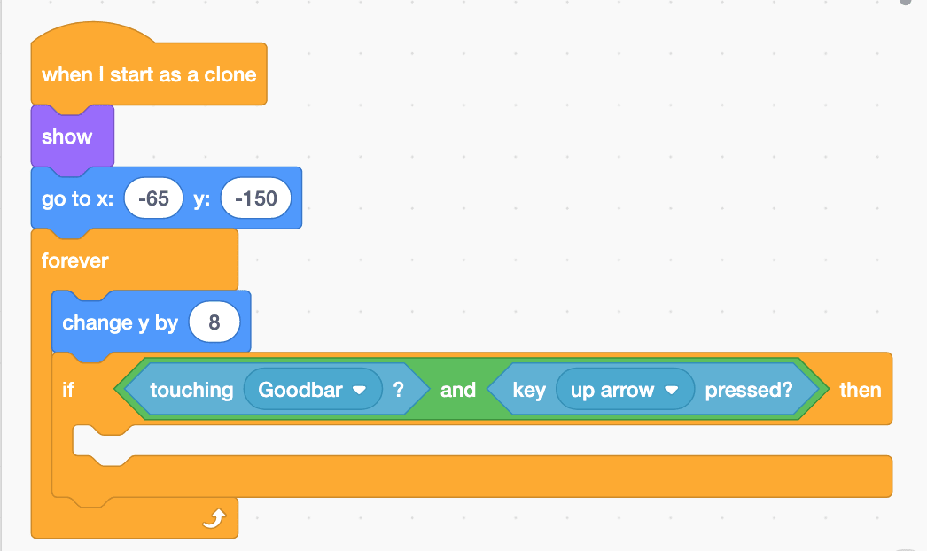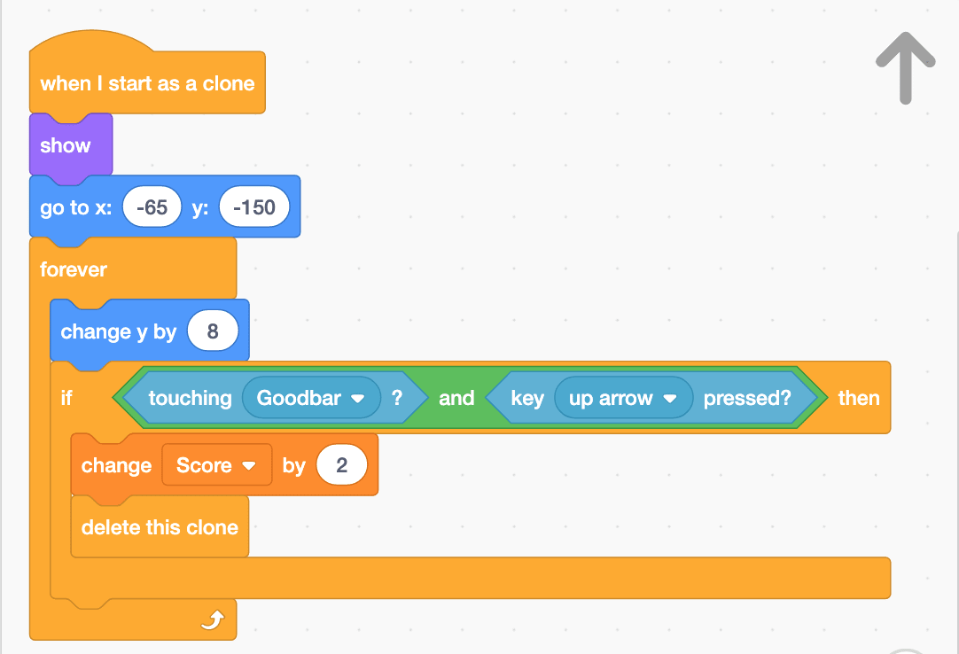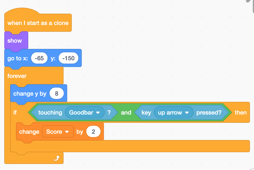 The player should gain 2 points if they press the correct arrow key at the same time that clone is touching the Goodbar, then delete the clone.