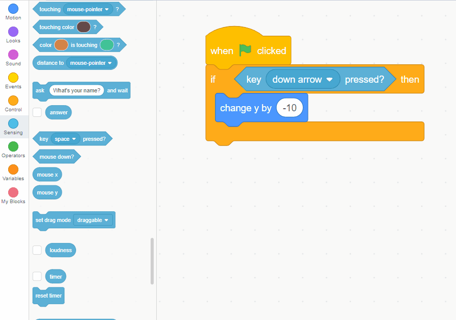 You only want the main character to move down if the player presses the down key. Like before, you need the "if-statement" block, found in the orange "control" blocks.
