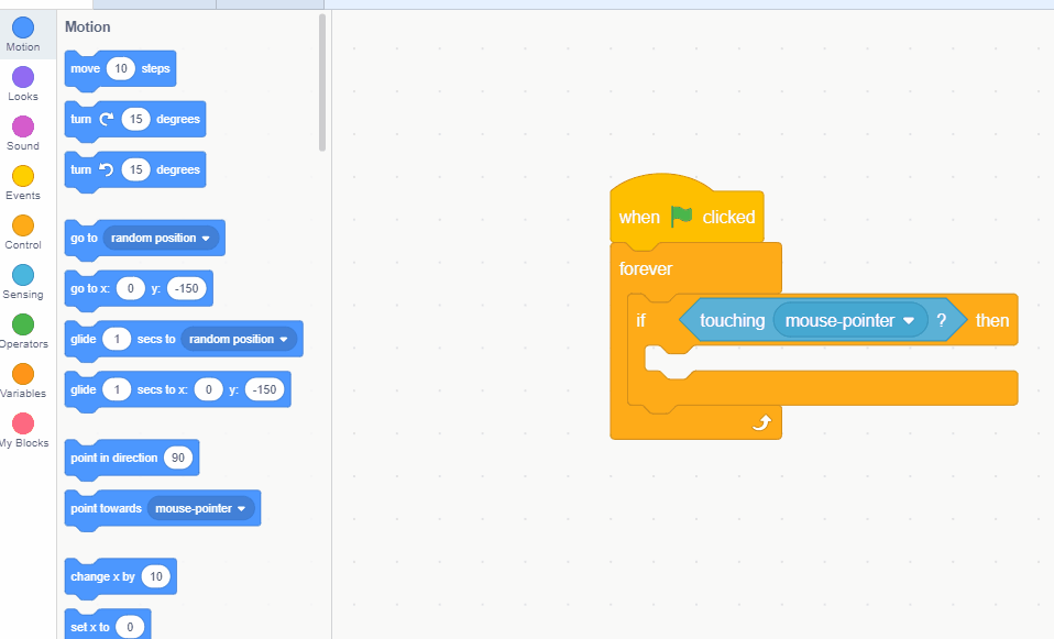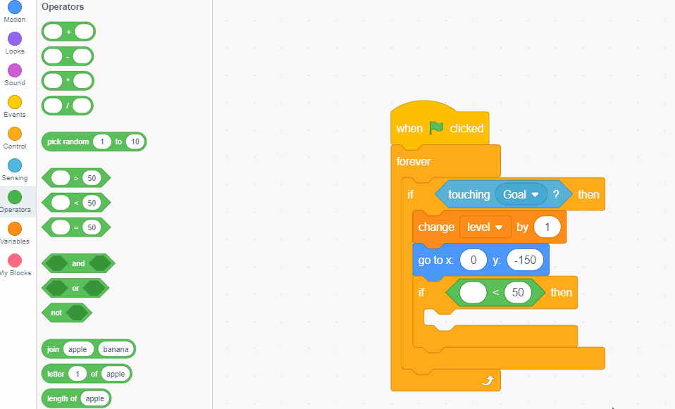 We will add another condition by adding another "when green flag clicked" and "forever loop" and "if then" block. This time the condition will be touching the goal.