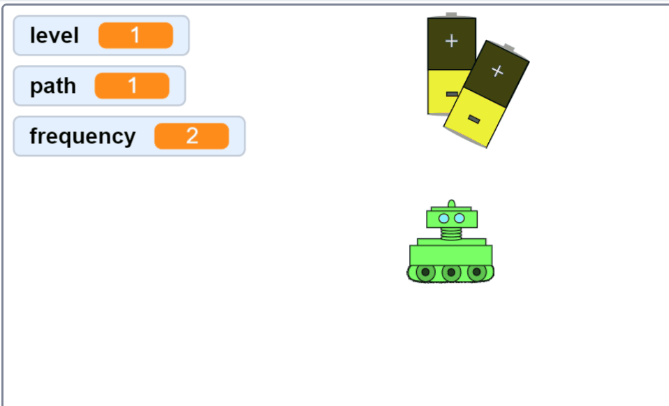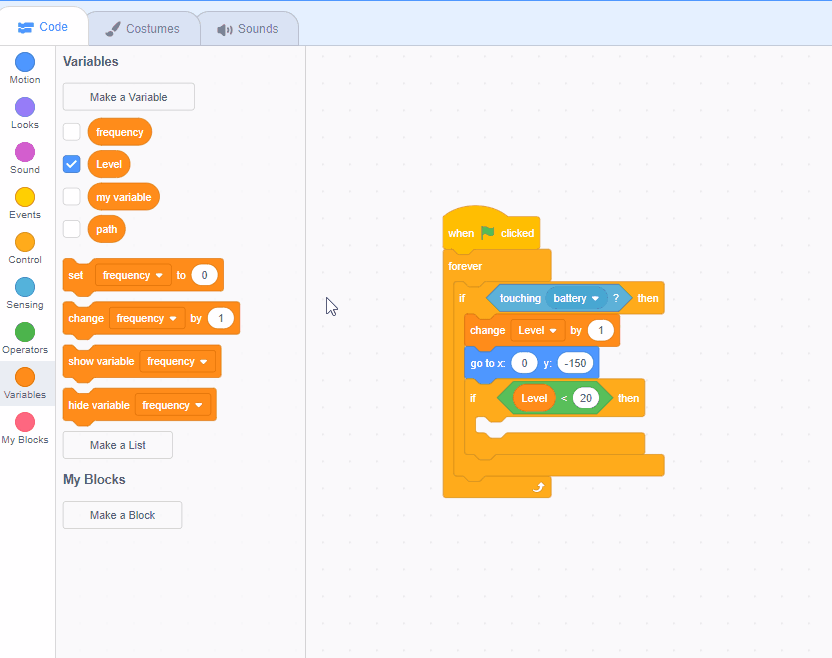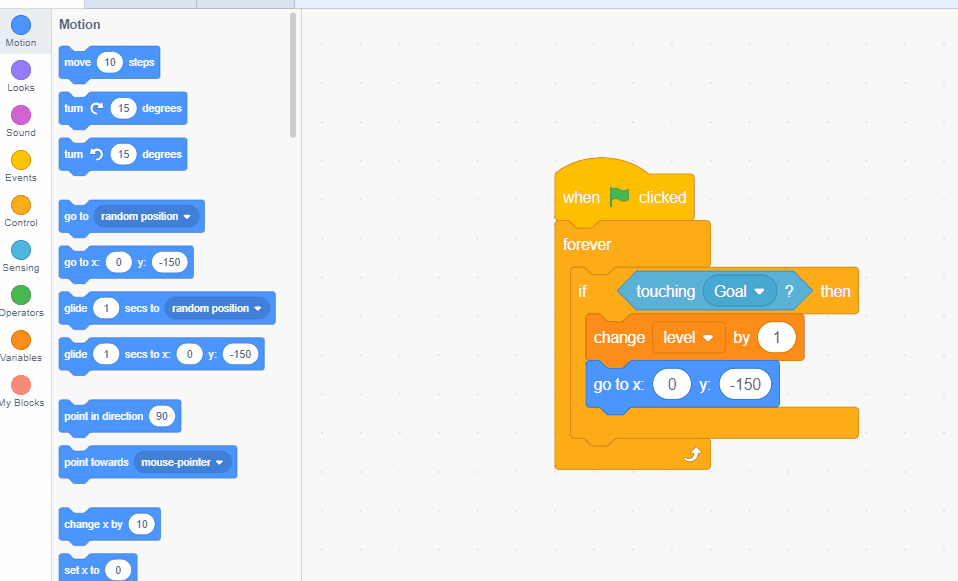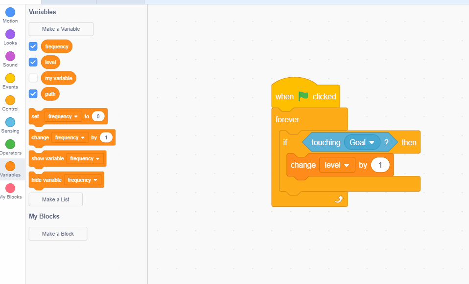 Change the condition like last time from "mouse-pointer" to "goal" When we hit the goal the level should go up by 1. We can use a "change _____ by 1" block to do this. Be careful to set it to the right variable.