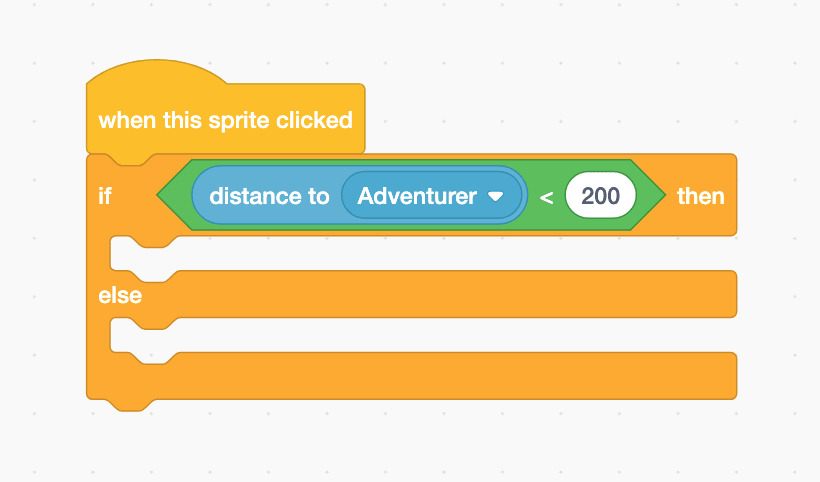 To get the distance from the Stone sprite to the Adventurer sprite, go to the light blue "Sensing" tab and find the "distance to ___" block. Click on 'mouse-pointer' and select 'Adventurer' from the list. This block goes in the first space of your less than block.