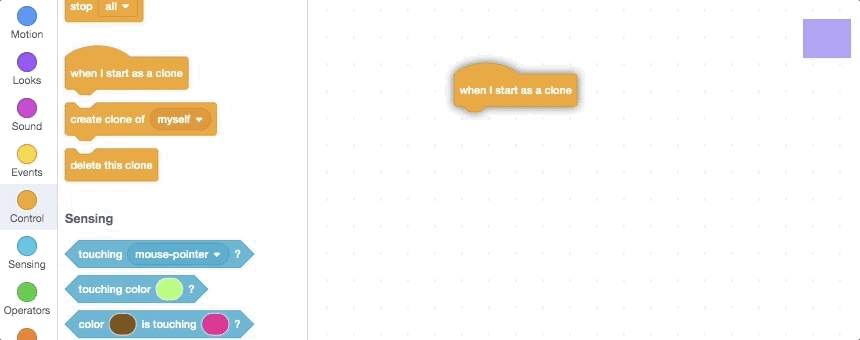 We need to get our clones to show up so they can attack the enemy. First grab the "when I start as a clone" block from the bottom of control, then attach the "looks" block to make the clones show up.