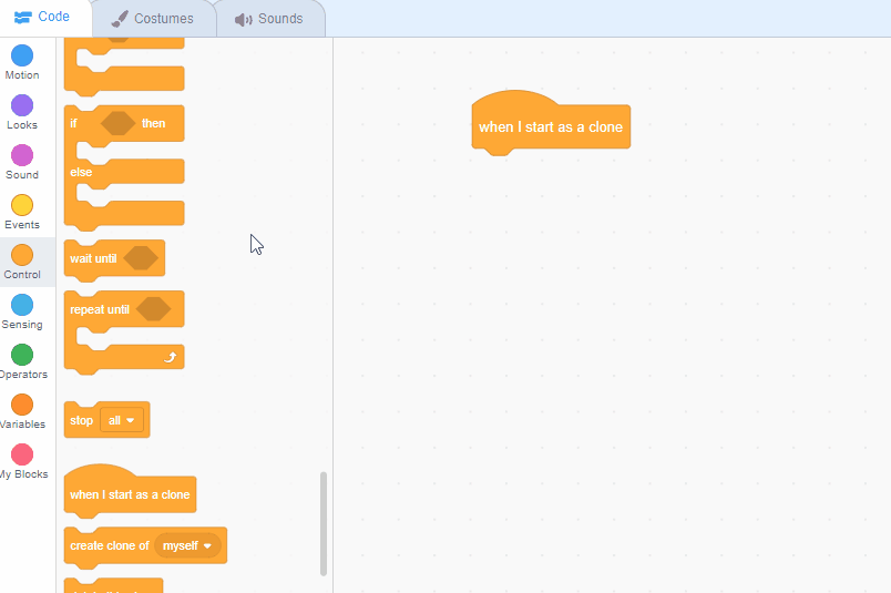 Let's grab a "when I start as clone" and "if then" block from Control, then in Operators, we will use the "blank equals 50" block and change it to "path equals 1".