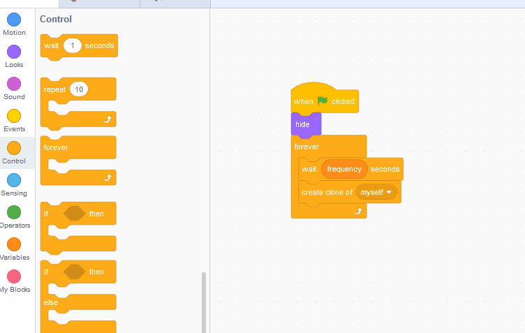 At the bottom of control add a "create a clone of myself" block. Add the "frequency" variable to the "wait 1 second" block, then a "hide" statement to the original to remove it from the screen.