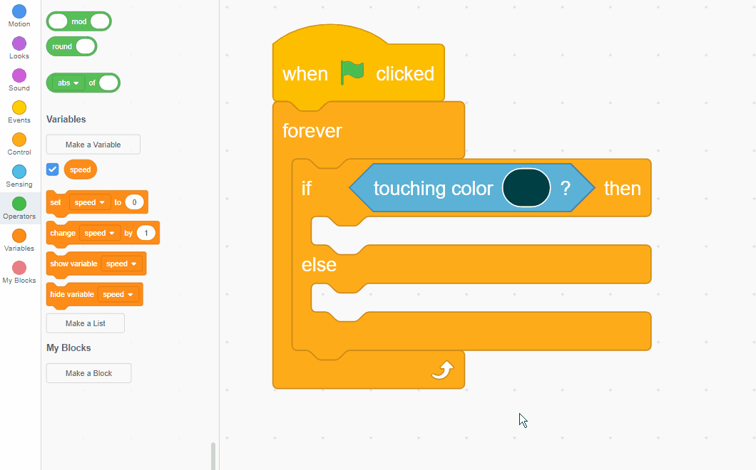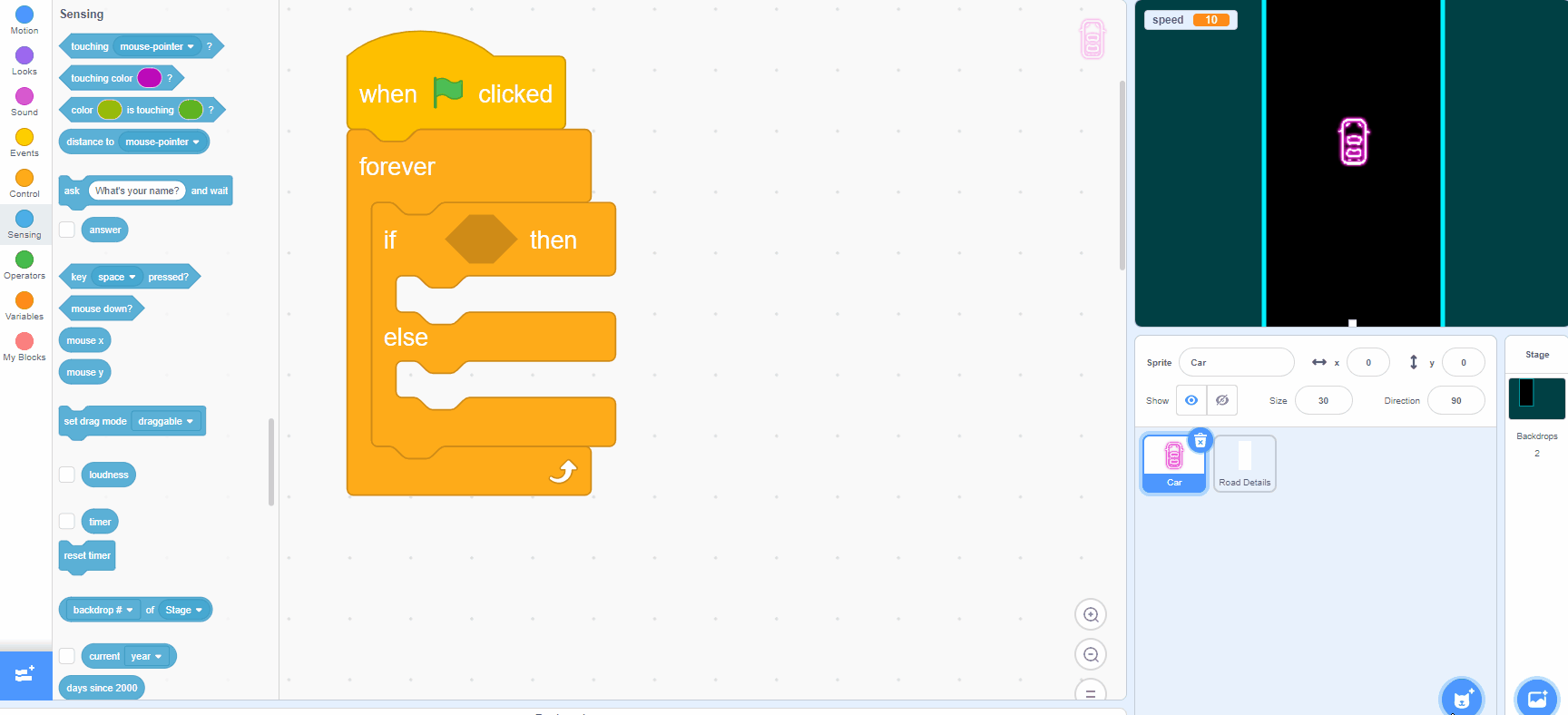 In your car, you'll need a "when green flag clicked" block from the "Events" section. You'll also need a "forever" loop and a "if _ then _ else _" block, both from the "control" section.