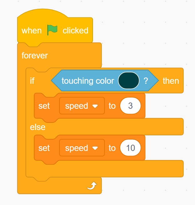 Use a "sensing" block called "touching color ___" and put it in the "if" blank. Use the eyedropper tool to select the exact color of your grass. Be sure to watch the gif if you're unsure of how to use the eyedropper tool!