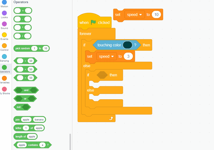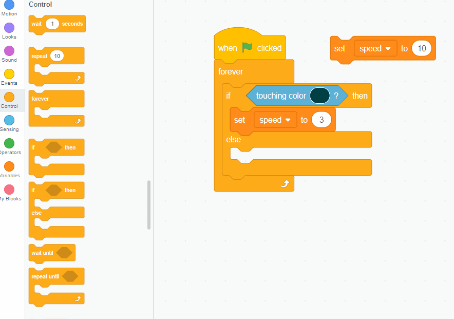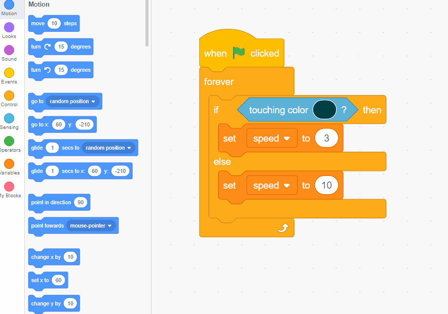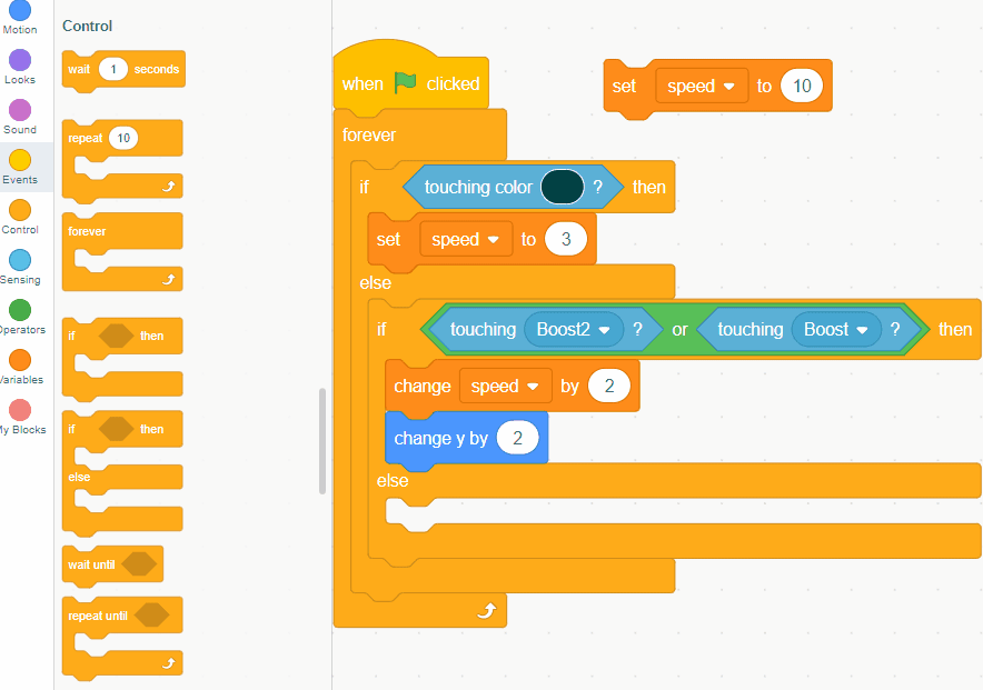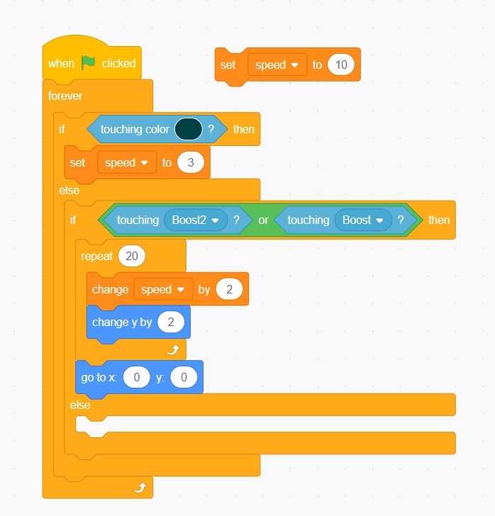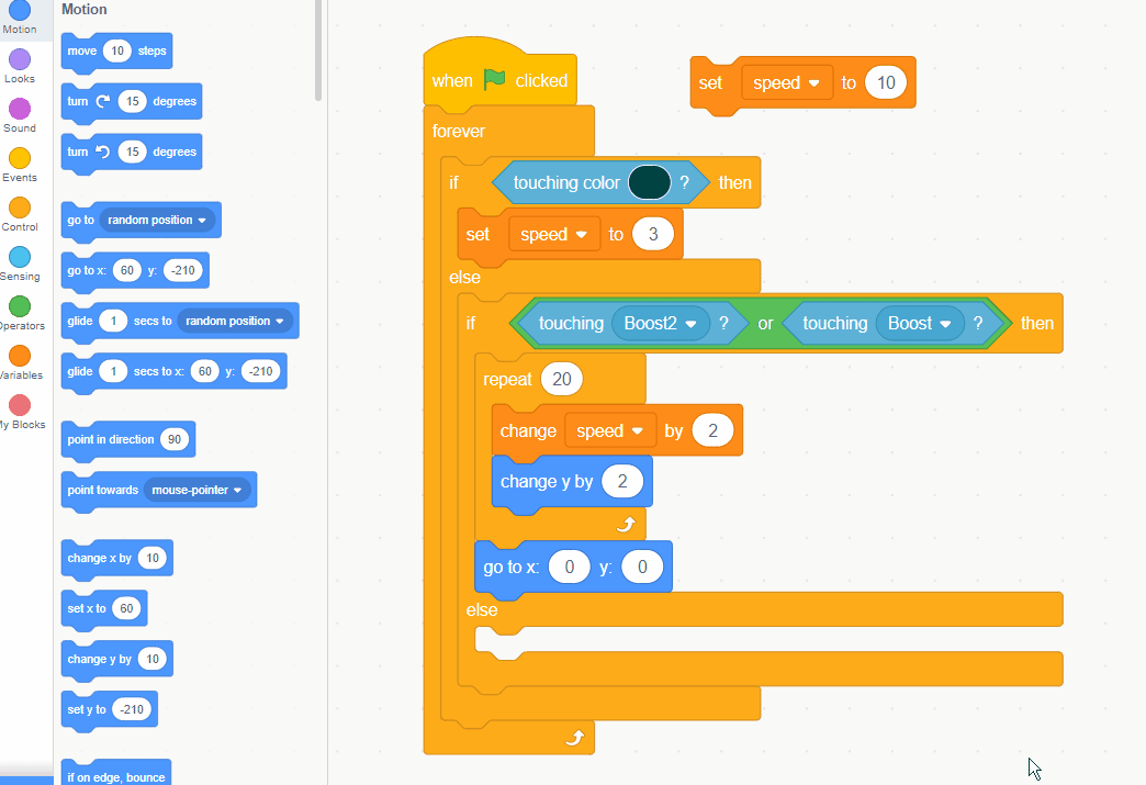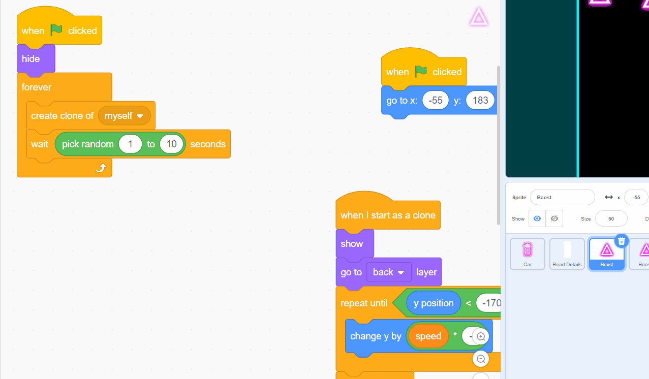 The car should be checking if it drives over the boost sprite. If it does, the speed variable should raise, and the car should also be launched forward. After it speeds up, the car should be returned to the middle of the screen and slow down.