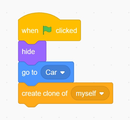 Attach a "motion" block called "go to ___" and change it to say the name of your car sprite.