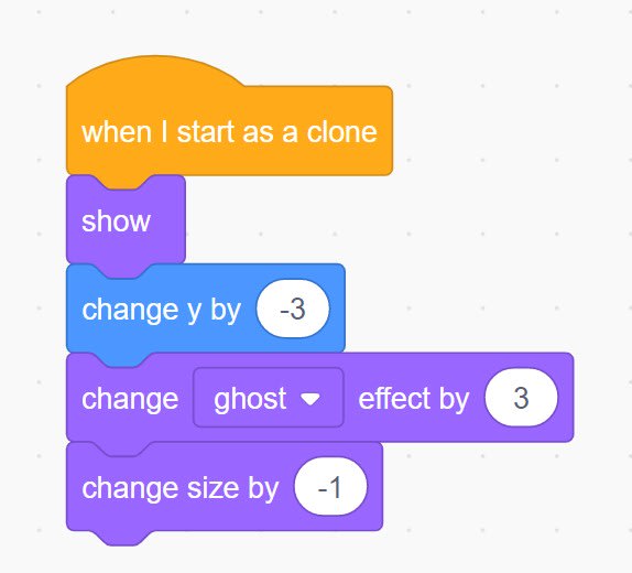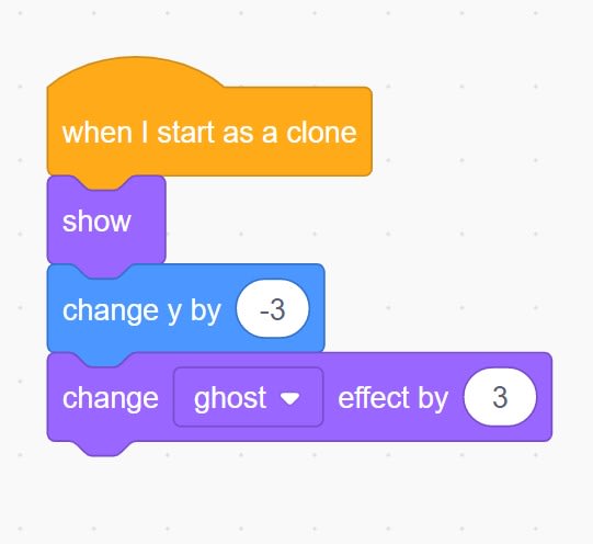 Attach a "looks" block called "change __ effect by ___." Change ghost effect by 3.