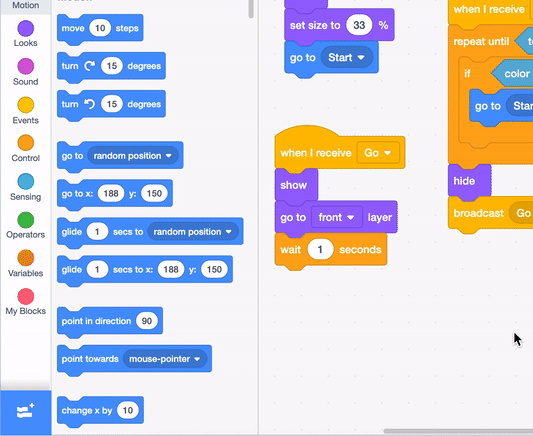Get a "glide 1 secs to random position" block from the dark blue "Motion" tab, and add it to the code after the "wait 1 seconds" block. Then change 'random position' to the first colored circle you want the car to drive to.