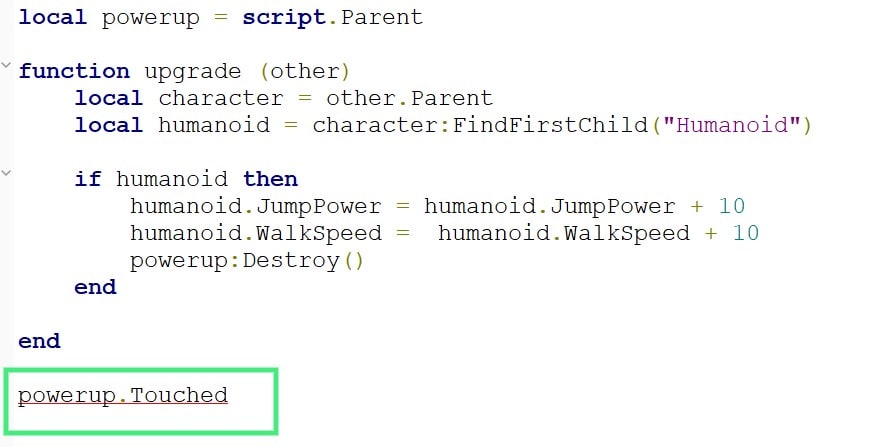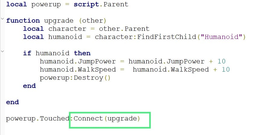 Connect your "upgrade" function when the door is touched. This is like making an imaginary Scratch code that says something like "When powerup is touched, upgrade player."