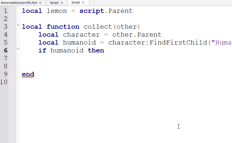 We'll keep track of whatever thing hit your lemon with a local variable. We'll call the variable "character" and then set it equal to "other." (Remember, "other" is whatever "other" object ran into your lemon.)