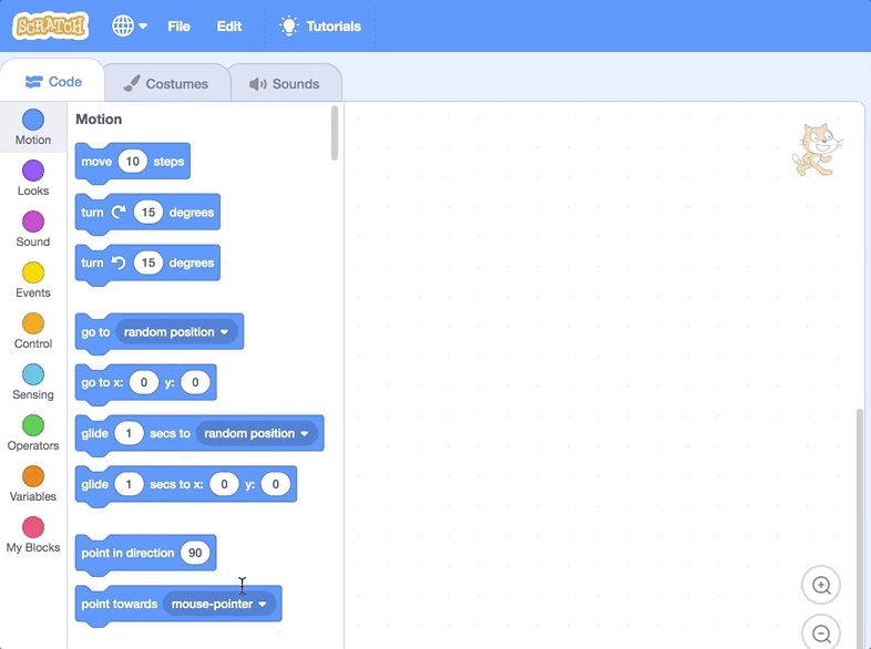 All the blue blocks in Scratch move sprites around the screen. The "move 10 steps" block moves the sprite 10 steps in the direction it's facing right now.