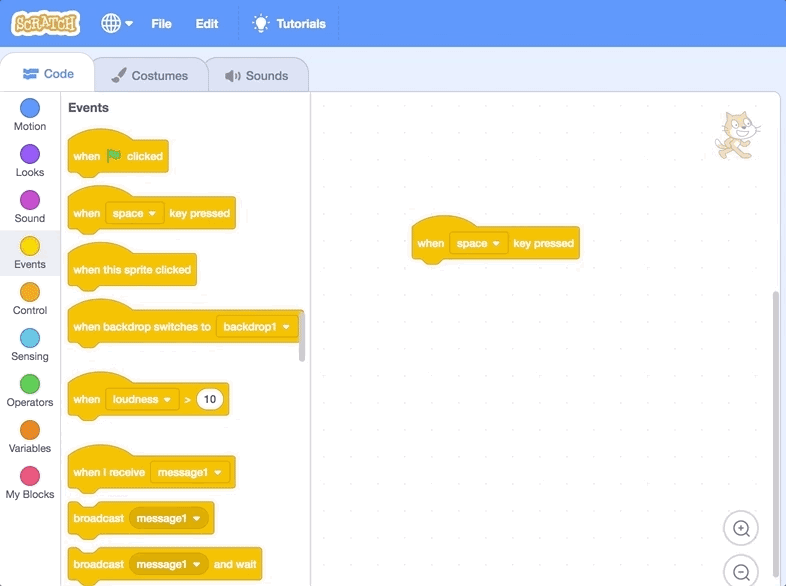In Scratch, all the code blocks you can use are on the left side of the screen. They're divided up into different color categories. We want the cat to move when a key is pressed on the keyboard, so that means we want to start with an Event block. Event blocks wait for something to happen, then trigger other code to start running.