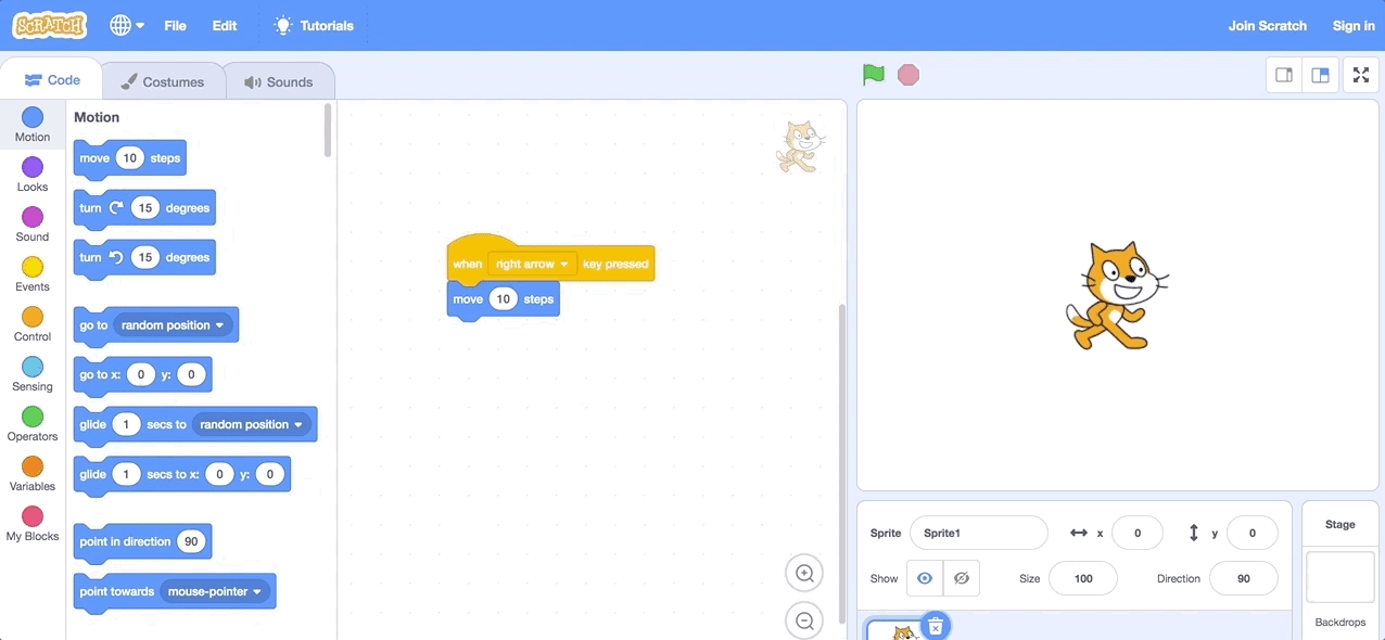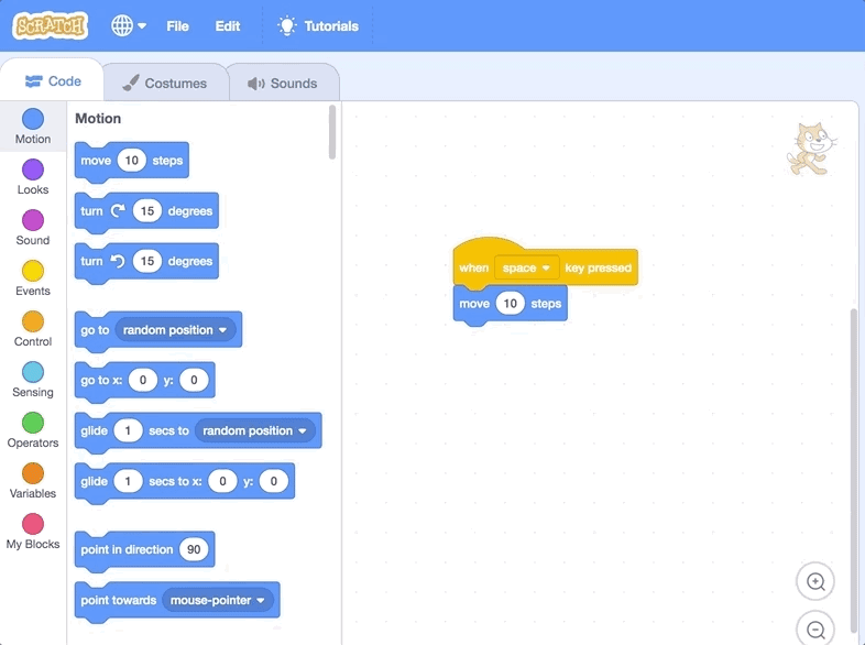 Click on the blue Motion circle at the left side of the screen, and drag in a "move 10 steps" block. Connect the block to the "when space key pressed" by moving it directly under the Event block until the seem to snap together.